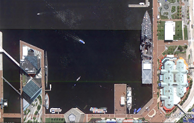 Let’s start with a wide-view of the naval ships on display at the Baltimore Maritime Museum in Baltimore, Maryland. Historic ships that you can zoom in on and see close up in Google Earth or Maps include the last sail-only warship USS Constellation (lower left); the submarine USS Torsk (upper left) which sunk the last enemy ship in World War II; and the cutter USCGC Taney (upper right), the last ship still floating that fought during the Pearl Harbor attack.